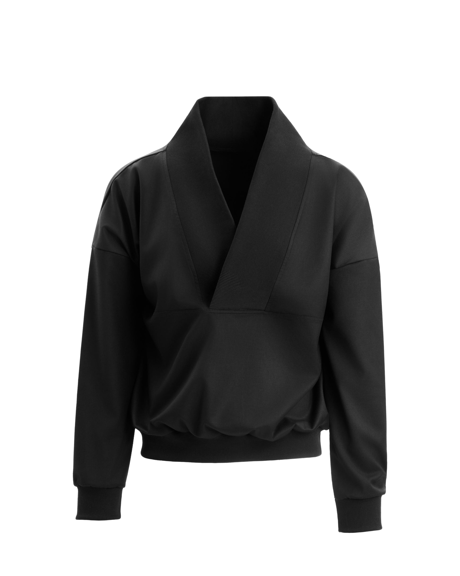 Bluză neagră cu guler amplu în V, inspirată din estetica minimalistă.