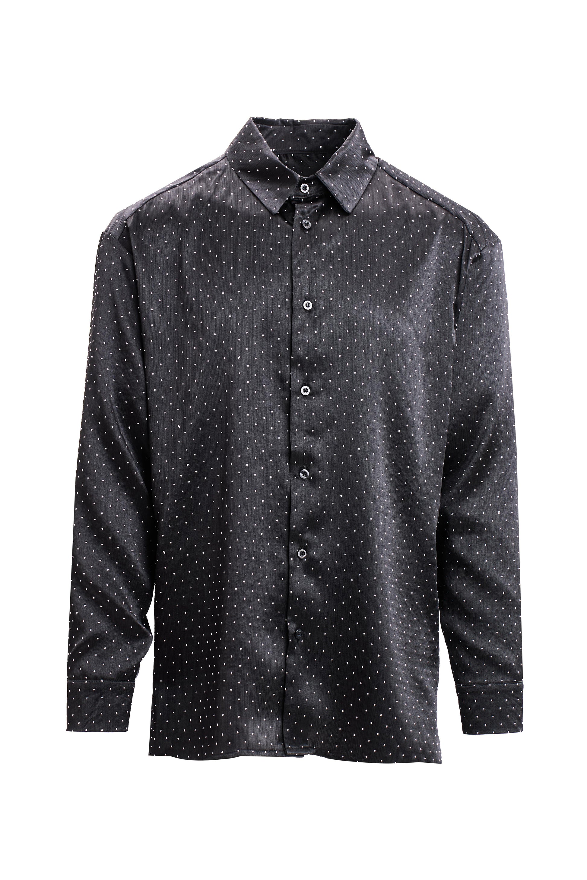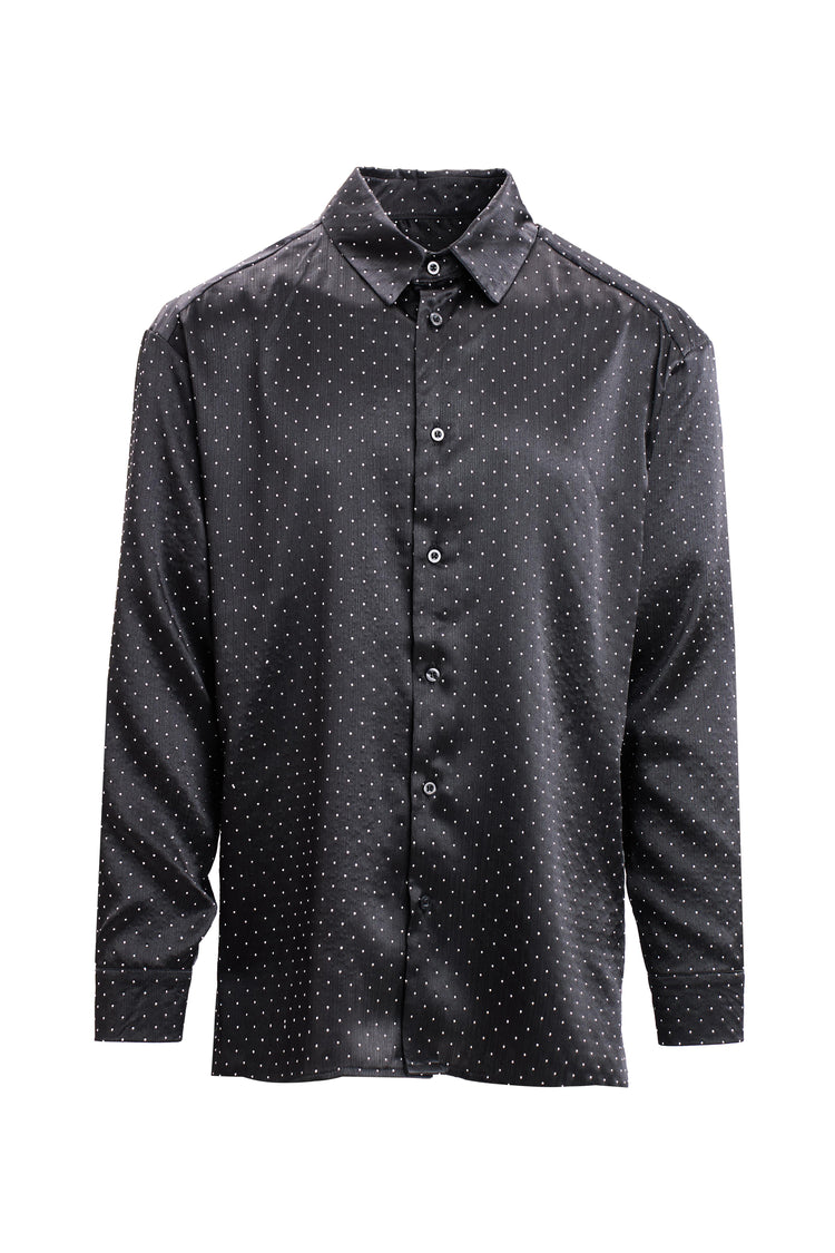 Cămașa neagră cu buline albe aduce un stil modern și subtil elegant, perfect pentru orice ocazie.