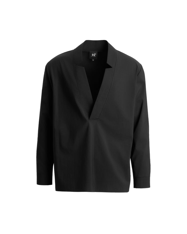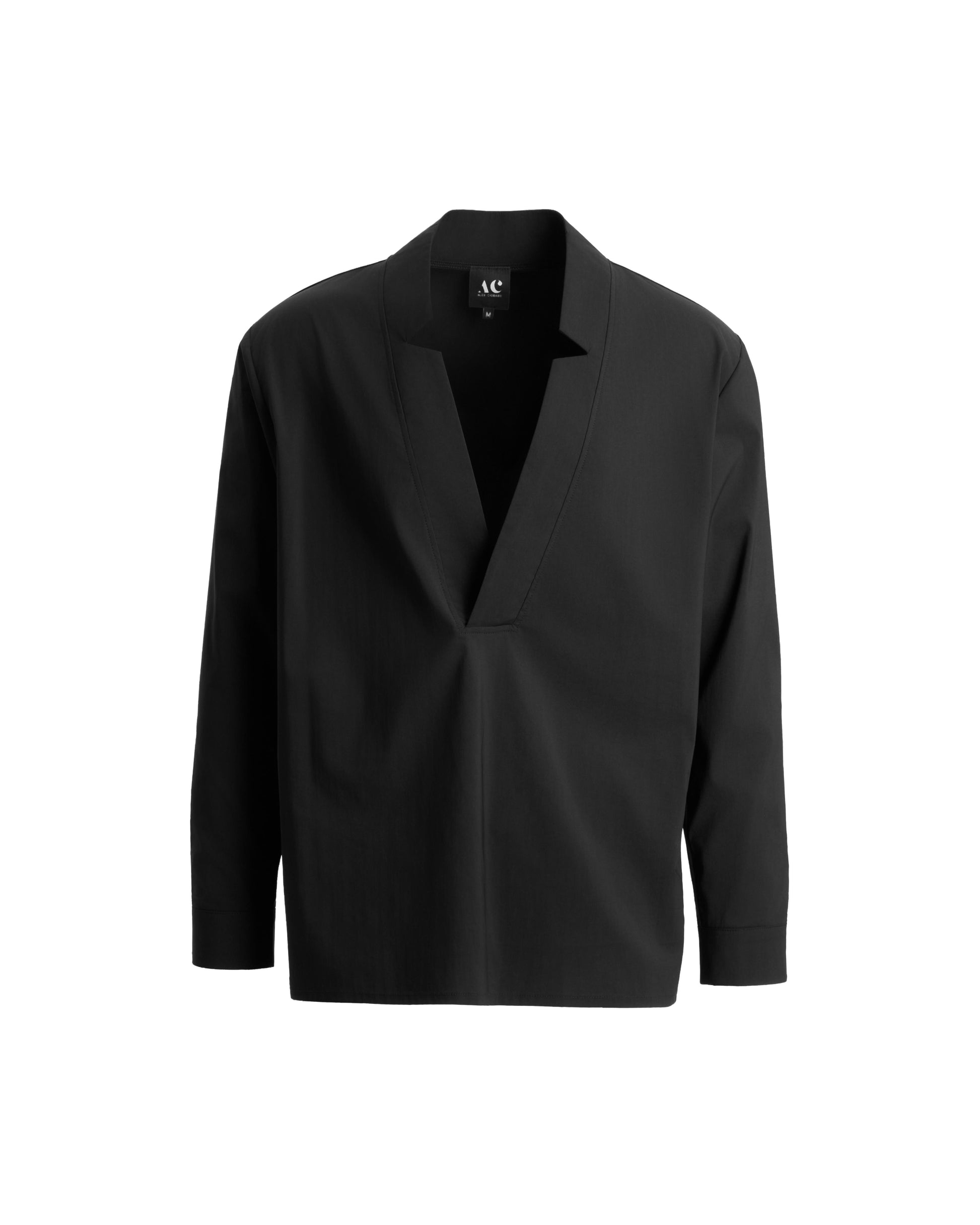 Bluză neagră cu guler deschis în V, construită pe o linie fluidă și minimalistă.