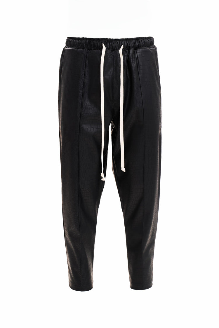 Pantaloni negri din piele, un model cu aspect puternic și modern, evidențiat de textura discretă și șnurul bej contrastant. Designul transmite stil și încredere, fiind alegerea perfectă pentru ținute în care vrei un plus de prezență și rafinament.