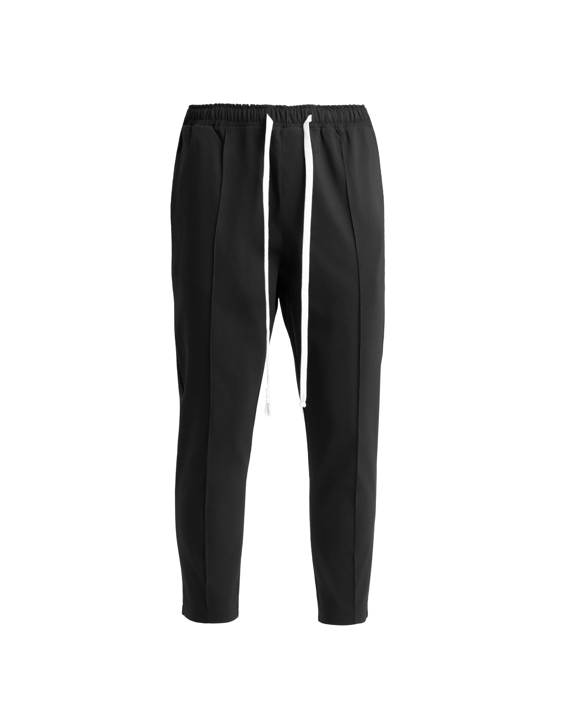 Pantaloni negri cu snur bej contrastant.